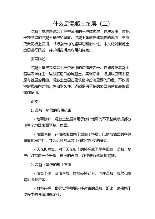 二、混凝土垫层的定义混凝土垫层是指在地基上铺设一层混凝土,以填平地基不平整、提高地基承载力、保证结构稳定等目的而形成的一种结构层。