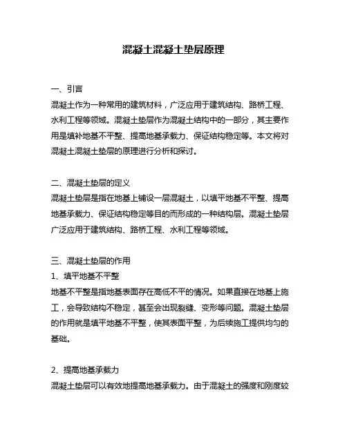 混凝土混凝土垫层原理一、引言混凝土作为一种常用的建筑材料,广泛应用于建筑结构、路桥工程、水利工程等领域。