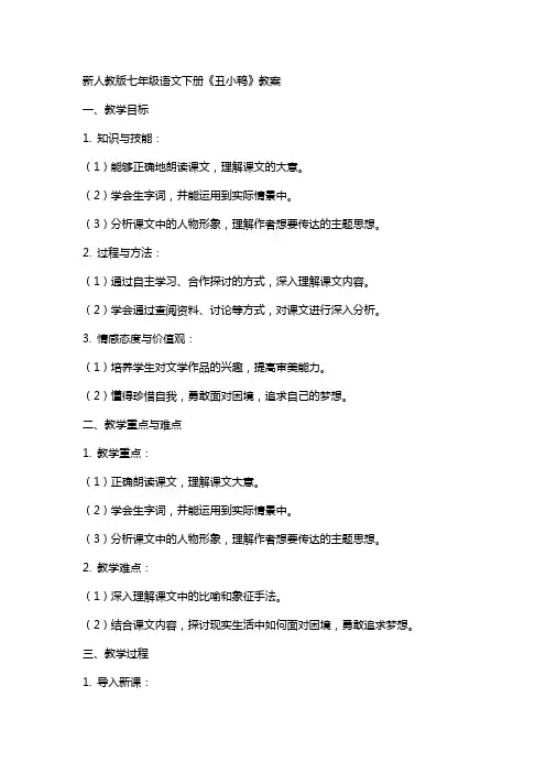 新人教版七年级语文下册《丑小鸭》教案一、教学目标1. 知识与技能:(1)能够正确地朗读课文,理解课文的大意。