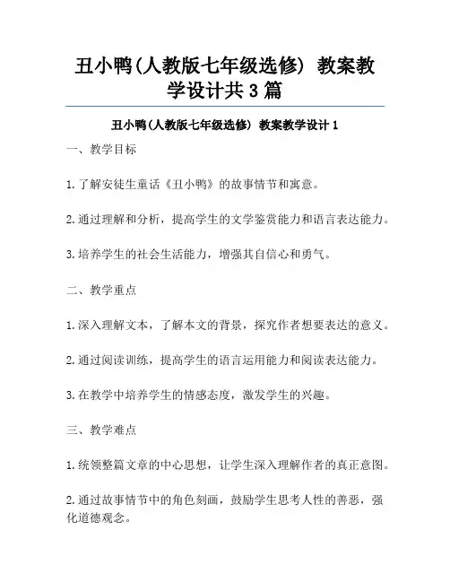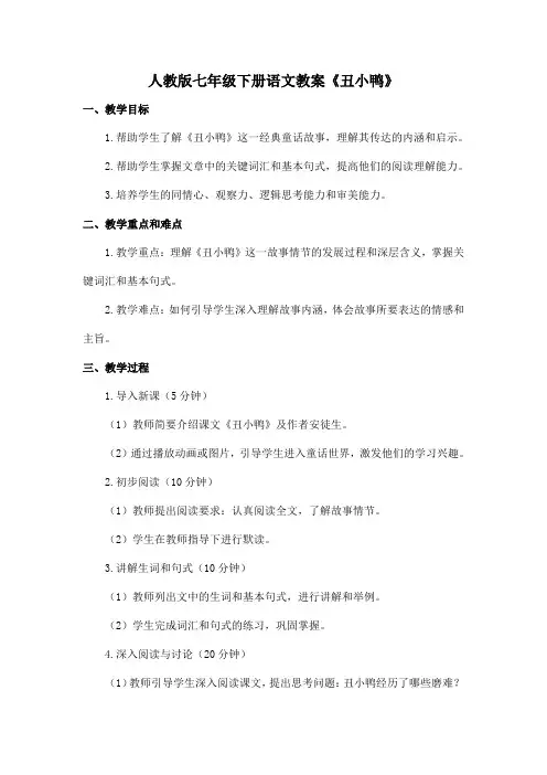 人教版七年级下册语文教案《丑小鸭》一、教学目标1.帮助学生了解《丑小鸭》这一经典童话故事,理解其传达的内涵和启示。