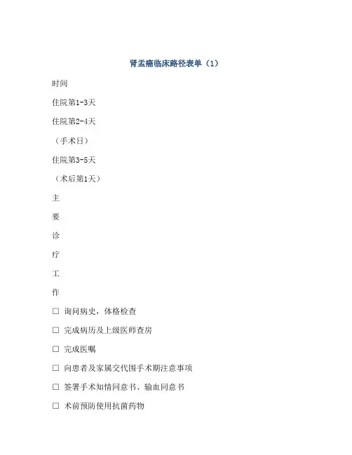 嘱患者勿化妆,排空膀胱□切□敷料□管道护理6.□基础护理□心、肺功能□其他:□患者交接(遵照手术患者交接单进行)□疼痛护理□微量泵护理7.饮食:1.6术前护理:□准备麻醉床□协助生活护理□普通饮食□治疗饮食□其他:□标本采集 1.4术后护理:□心理护理8.标本采集:□活动、卧位指导□卧位、活动指导 2.专科观察与护理:□血标本□痰标本□预防压疮护理□生命体征监测 2.1活动指导:□大小便标本□营养状况评估□静脉输液氧疗□床上活动9.辅助检查:□手术耐受性评估□心电监护□微量泵护理2.2□观察呼吸情况□静脉尿路造影□磁共振□生命体征监测□切□敷料□管道护理2.3□观察导尿管引流是否通畅□胸片□心电图□B超□呼吸道准备□疼痛护理□术后评估 2.4尿液及颜色:□CT□心、肺功能□其他:□胃肠道准备 2.专科观察与护理:□血性□淡血性□黄清10.专科观察与护理:□手术区皮肤的准备 2.1 活动指导:2.5□观察肾窝引流管是否通畅□观察有无血尿及腰痛□配血准备□床上活动 2.6□观察肾窝引流管是否有引流物以及肾窝引流管引流液的颜色11.□健康教育指导□术前禁食、禁饮 2.2□观察导尿管引流是否通畅 2.7□观察切口敷料有无渗湿12.有无变异:□有□无□心理护理 2.3尿液及颜色: 2.8□营养护理13□其他;□其他:□血性淡□血性□黄清 2.9□管道护理(泌尿外科)肾癌临床护理路径表单(内容可编辑)患者: 姓名: 性别: 年龄: 床号: 住院号:2.专科观察与护理:2.4□观察肾窝引流管是否通畅2.5□观察肾窝引流管是否有引流物以及肾窝引流管引流液的颜色2.6□观察切口敷料有无渗湿2.10□用药指导2.1术前适应性训练: 2.7□营养护理3.出院指导:□训练床上大小便 2.8□用药指导□用药指导2.2□观察有无血尿及腰痛3. □健康教育指导□康复训练及注意事项宣3.□健康教育指导4.有无变异:□有□无□嘱患者定期复查4.有无变异:□有□无5. □其他:□告知电话回访5.□其他:□协助办理出院4.□其他:评价: □完成评价: □完成评价:□完成评价:□完成□部分完成 □未完成□部分完成 □未完成□部分完成 □未完成□部分完成 □未完成签名:签名:签名:签名:。
