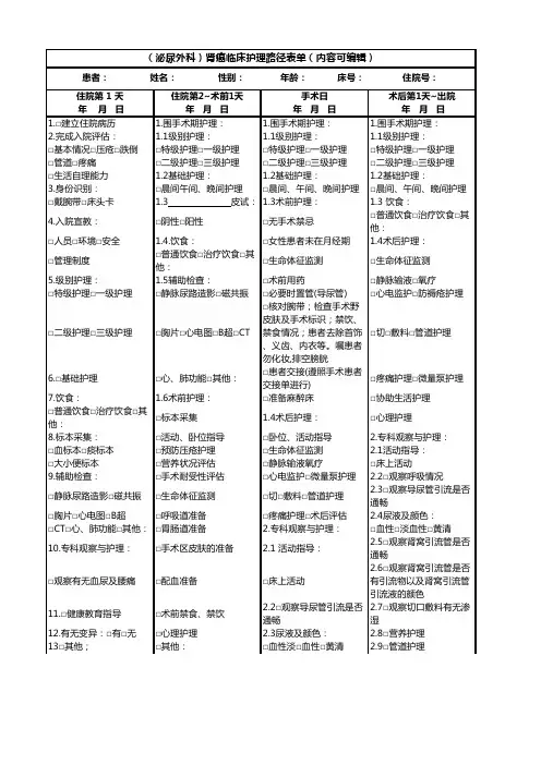住院第 1 天住院第2~术前1天手术日术后第1天~出院 年 月 日年 月 日年 月 日年 月 日1.□建立住院病历 1.围手术期护理: 1.围手术期护理: 1.围手术期护理:2.完成入院评估:1.1级别护理:1.1级别护理:1.1级别护理:□基本情况□压疮□跌倒□特级护理□一级护理□特级护理□一级护理□特级护理□一级护理□管道□疼痛□二级护理□三级护理□二级护理□三级护理□二级护理□三级护理□生活自理能力 1.2基础护理:1.2基础护理:1.2基础护理:3.身份识别:□晨间午间、晚间护理□晨间、午间、晚间护理□晨间、午间、晚间护理□戴腕带□床头卡 1.3 皮试:1.3术前护理: 1.3 饮食:4.入院宣教:□阴性□阳性□无手术禁忌□普通饮食□治疗饮食□其他:□人员□环境□安全 1.4.饮食:□女性患者未在月经期 1.4术后护理:□管理制度□普通饮食□治疗饮食□其他:□生命体征监测□生命体征监测5.级别护理:1.5辅助检查:□术前用药□静脉输液□氧疗□特级护理□一级护理□静脉尿路造影□磁共振□必要时置管(导尿管)□心电监护□防褥疮护理□二级护理□三级护理□胸片□心电图□B超□CT □核对腕带;检查手术野皮肤及手术标识;禁饮、禁食情况;患者去除首饰、义齿、内衣等。