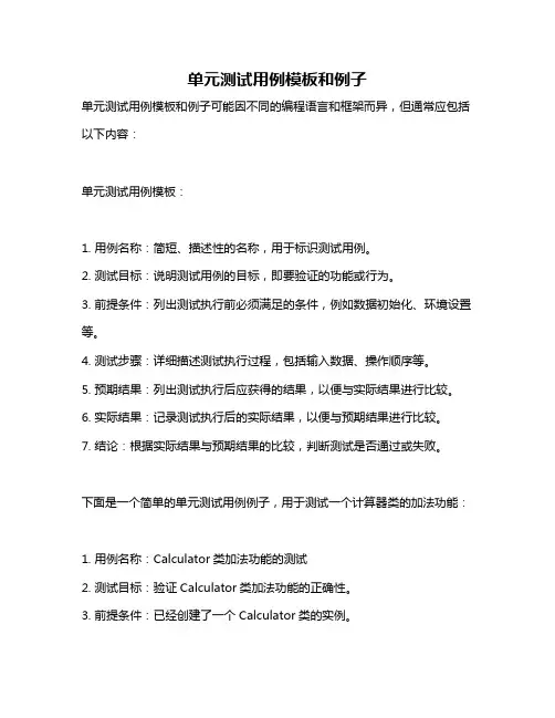 单元测试用例模板和例子可能因不同的编程语言和框架而异,但通常应包括以下内容: