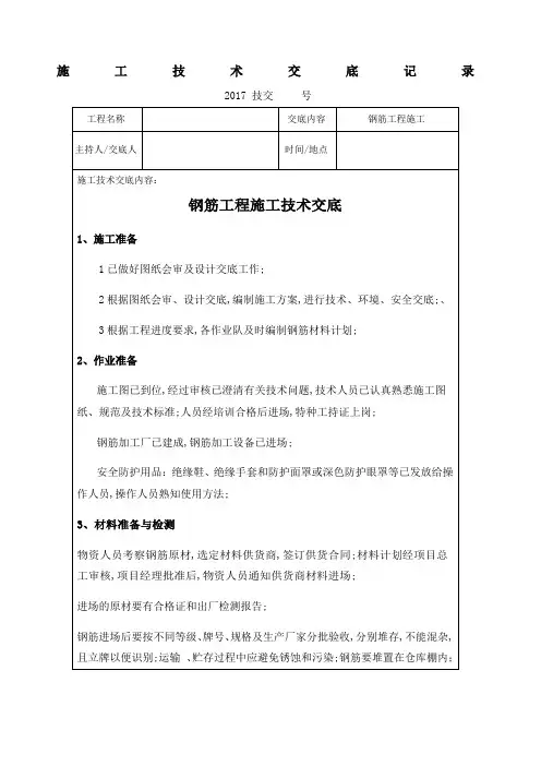 三、交底内容1. 施工人员要求- 施工人员必须经过安全技术培训,考核合格后方可上岗作业。