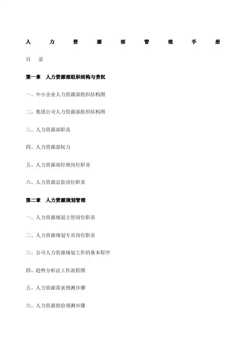 人力资源部管理手册目录第一章人力资源部组织结构与责权一、中小企业人力资源部组织结构图二、集团公司人力资源部组织结构图三、人力资源部职责四、人力资源部权力五、人力资源部经理岗位职责六、人力资源总监岗位职责第二章人力资源规划管理一、人力资源规划主管岗位职责二、人力资源规划专员岗位职责三、公司人力资源规划工作的基本程序四、趋势分析法工作流程图五、人力资源需求预测步骤六、人力资源供给预测步骤七、人力资源管理费用构成要素八、人力资源管理费用编制流程九、人力资源原始成本核算内容十、人力资源重置成本核算内容十一、预算执行情况反馈流程十二、预算差异分析报告十三、人力资源年度规划表(范本一)十四、人力资源年度规划表(范本二)十五、人力资源需求预测流程(范本一)十六、人力资源需求预测流程(范本二)十七、人力资源规划管理流程(范本一)十八、人力资源规划管理流程(范本二)第三章招聘管理一、招聘主管岗位职责二、招聘专员岗位职责三、人员需求申请表四、内部招聘工作流程图五、面试实施流程图六、应聘人员登记表七、员工面试记录表八、面试成绩评定表(一)九、面试成绩评定表(二)十、面试成绩评定表(三)十一、招聘计划管理流程十二、招聘与录用流程十三、内部招聘管理流程十四、内部招聘管理流程(二)十五、员工试用管理流程十六、员工转正工作流程十七、人员筛选流程图十八、初试进程图十九、内部人员竞聘流程图二十、内部人员岗位竞聘申请表第四章培训管理一、培训主管岗位职责二、培训专员岗位职责三、培训需求提出方式四、外派培训的方式五、培训需求调查流程六、员工培训管理流程七、外派培训管理流程八、公司第一阶段培训计划表九、公司第二、三阶段培训计划表十、培训师评估调查表十一、培训实施流程十二、技术人员培训常用方法十三、员工培训需求调查表十四、外派培训计划表第五章绩效管理一、绩效主管岗位职责二、绩效专员岗位职责三、员工绩效考核表四、员工自我述职报告五、员工技能考核结果量化表六、员工德能考核结果量化表七、营销人员考核表八、生产人员考核表九、绩效考核管理流程十、月度绩效考核流程十一、员工奖惩管理流程十二、员工提案管理流程十三、总经理考核方案表十四、人力资源总监考核方案表十五、人力资源总监考核方案表十六、财务总监考核方案表十七、市场总监考核方案表十八、生产总监考核方案表十九、技术总监考核方案表二十、中层管理人员绩效改进计划第六章薪资管理一、薪资主管岗位职责二、薪资专员岗位职责三、薪酬福利管理流程四、员工工资管理流程第七章人事事务管理一、人事事务主管岗位职责二、人事事务专员岗位职责三、档案管理专员岗位职责四、员工休假规定五、员工出差申请表六、差旅费用标准及审批表七、人员调动流程图八、职位调动评估表九、员工调动审批表十、人事调动交接单十一、离职移交清单十二、入职新员工人事档案管理流程十三、员工离职面谈表十四、员工离职结算表十五、人事档案管理系列表十六、一般出差管理流程十七、因公出国出差管理流程十八、员工离职管理流程十九、人事档案管理流程第八章劳动关系管理一、劳动关系主管岗位职责二、劳动关系专员岗位职责三、劳动合同专员岗位职责四、解除劳动合同申请表五、解除劳动合同流程六、劳动纠纷处理流程第一章人力资源部组织结构与责权一、中小企业人力资源部组织结构图二、集团公司人力资源部组织结构图三、人力资源部职责四、人力资源部权力五、人力资源部经理岗位职责六、人力资源总监岗位职责第二章人力资源规划管理一、人力资源规划主管岗位职责二、人力资源规划专员岗位职责三、公司人力资源规划工作的基本程序四、趋势分析法工作流程图五、人力资源需求预测步骤六、人力资源供给预测步骤七、人力资源管理费用构成要素八、人力资源管理费用编制流程九、人力资源原始成本核算内容十、人力资源重置成本核算内容十一、预算执行情况反馈流程十二、预算差异分析报告填报单位:填报人:填报时间:十三、人力资源年度规划表一填表人:审核:填表时间:年月日十四、人力资源年度规划表二填表人:审核人:十五、人力资源需求预测流程(范本一)十六、人力资源需求预测流程(范本二)十七、人力资源规划管理流程(范本一)十八、人力资源规划管理流程(范本二)第三章招聘管理一、招聘主管岗位职责二、招聘专员岗位职责三、人员需求申请表四、内部招聘工作流程图五、面试实施流程图六、应聘人员登记表实施阶主要工简要说各用人单位根据工作需要,提出人员人力资源部根据用人部门的用人需求,拟定并发布内部招聘公告,发人力资源部根据职位说明书及其他相关要求对应聘者的对面试合格的人员发布录用通知,被录用者到原所在部应聘职位:填表日期:年月日七、员工面试记录表应聘者基本情况面试记录面试者:所属部门:面试日期:年月日面试评价八、面试成绩评定表(一)九、面试成绩评定表(二)十、面试成绩评定表(三)十一、招聘计划管理流程十二、招聘与录用管理流程十三、内部招聘管理流程(一)十四、内部招聘管理流程(二)十