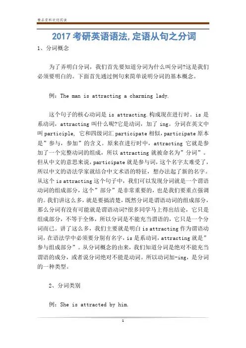 考研英语语法讲解三、动名词1.必须接动名词做宾语的动词牢记下列要求接动名词做宾语的动词:acknowledge,advocate,anticipate,appreciate,advise,avoid,admit,confess,consider,defend,delay,deny,dislike,enjoy,escape,excuse,fancy,favor,finish,forgive,imagine,include,involve,justify,keep mind,miss,mention,pardon,practice,postpone,permit,report,resent,resume,recall,recollect,risk,resist,suggest,tolerate.如:Although a teenager,Fred could resist being told what to do and what not to do.I appreciate having been given the opportunity to study abroad two years ago.2.动名词做介词短语考生尤其要识别下列短语中的to是介词,不是不定式符号:object to,resort to,react to,contribute to,look forward to,be accustomed to,be committed to,be exposed to,be subjected to,be devoted to,be dedicated to,be opposed to,be reconciled to,be contrary to,be (get)used to,come close to,get down to,give oneself up to,prefer…to,see to,set to,take to,in addition to,with regard to,with a view to,on the way to.如:There was no sign that Mr. Jospin ,who keeps a firm control on the party despite having resigned from leadership of it,would intervene personally.Our modern civilization must not be thought of as having been created in a short period of time.Nowhere in nature is aluminum found free,owing to its always being combined with other elements,most commonly with oxygen.As the children become financially independent of the family,the emphasis on family financial security will shift from protection to saving for the retirement years.Everyone with half an eye on the unemployment figures knew that the assertion about economic recovery being just around the corner was untrue.四、分词分词起形容词和副词的作用,在句中做定语或状语。
