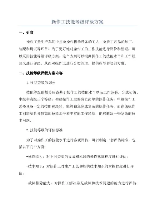 二、技能等级评级方案内容1.技能等级的划分技能等级的划分应该基于操作工的技能水平以及工作经验,分成初级、中级和高级三个等级。