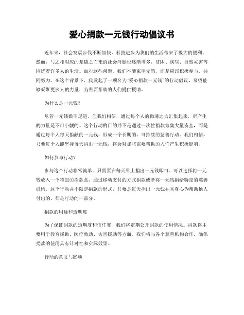 爱心捐款一元钱行动倡议书近年来,社会发展步伐不断加快,科技进步为我们的生活带来了极大的便利。