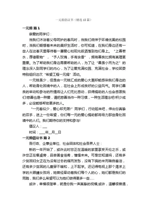最后,我诚挚地邀请大家加入到这个爱心捐款行动中,让我们用宽容、关爱、奉献和希望构建起一个更加美好的社会!谢谢大家!祝好!倡议人:XXX一元爱心捐款倡议书(二)尊敬的各位领导、亲爱的朋友们:大家好!今天,我代表一元爱心捐款项目组,向大家呼吁,共同参与一项伟大的事业——一元爱心捐款。