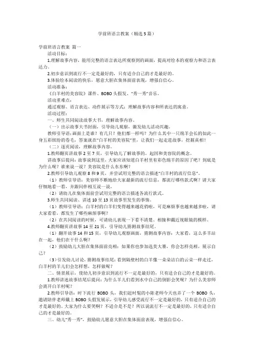 学前班语言教案(精选5篇)学前班语言教案篇一活动目标:1.理解故事内容,能用完整的语言表达所观察到的画面,提高对绘本的观察力和语言表达力。
