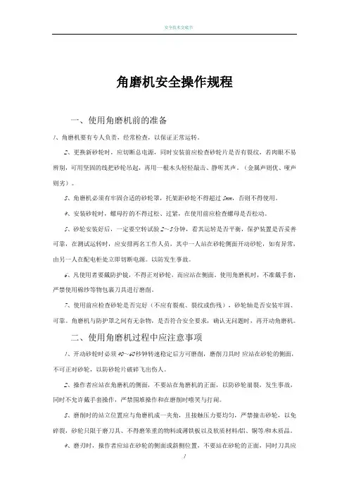 角磨机安全操作规程一、使用角磨机前的准备1、角磨机要有专人负责,经常检查,以保证正常运转。