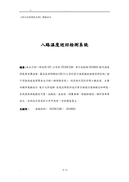 v .. . ..《单片机原理及应用》课程设计八路温度巡回检测系统摘要:本文介绍一种采用STC公司的STC89C52RC 单片机控制DS18B20数字温度传感器采集温度,最后在共阴极的LED灯上实时显示温度值的温度检测系统(由于实验及成本原因本文只做一路传输系统)。