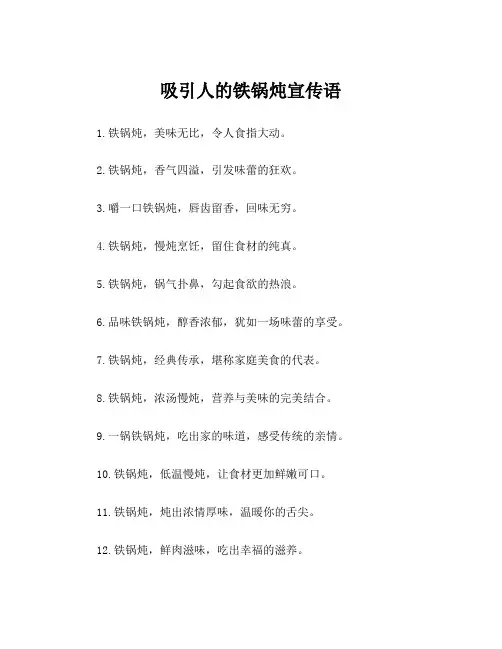 本文部分内容来自网络整理,本司不为其真实性负责,如有异议或侵权请及时联系,本司将立即删除!== 本文为word格式,下载后可方便编辑和修改! ==炖鱼的广告语篇一:水产料宣传广告语水产料宣传广告语1. 湘大鱼料情系父老乡亲!2. 养鱼想致富湘大来帮助3. 湘大一枝花养殖全靠它4. 养鱼湘大料卖鱼呱呱叫5. 湘大鱼料品质一流6. 湘大鱼饲料只做好鱼料7. 湘大鱼料一枝花养殖发家全靠它8. 养殖发家和致富湘大鱼料来帮助9. 用湘大水产料走科技致富之路10. 湘大鱼饲料养殖真需要11. 选湘大鱼料质量有保证12. 湘大鱼料优质高效13. 好鱼料湘大造14. 湘大鱼料好养殖效益高15. 湘大鱼料好发家致富早16. 湘大鱼料好养鱼真需要17. 湘大鱼料中国名牌18. 湘大牌鱼饲料中国驰名商标19. 要想养殖效益好首选湘大水产料 20. 湘大鱼饲料致力农家富裕篇二:石锅鱼广告词金韩美食即将盛大揭幕期待您的品鉴优雅的环境、古朴的风格、飘香的韩国烧酒、经典的韩国音乐、配以品味纯正的韩式烧烤、泡菜等特色佳肴,让您领略浓郁的异国风情,在炎炎夏季让你感受到‘韩流’的清爽怡人!金韩美食在炎炎夏日即将倾情推出正宗日韩料理:紫菜包饭、冷面,日式什锦寿司;精美西点:葡式蛋挞、意大利披萨,法式巧克力蛋糕;韩式凉拌菜、泡菜、顶级韩式烤肉:首尔烤牛扒、纽西兰顶级肥牛、美式杂扒、韩国精品五花肉、烤大虾、烤秋刀鱼、烤花岭等还有日式天妇罗、欧式鸡米花、美多思薯条、培根意大利面、娘惹饭等经典韩式料理!美味多多!让你大快朵颐!你想品尝大长今里面的美味韩国料理石锅拌饭吗?你想领略正宗纯正口味的韩国顶级烧烤吗?你想不用远渡重洋就可品尝到异域风情的韩国美味泡菜吗!金韩美食美味无极限,烤出韩国风,浪漫韩国味!篇二:阿里郎烤肉广告词阿里郎第一集 3分大宝溪吃肉记一、镜头从烤肉特写(一桌食客)摇到窗外(小女孩趴在窗口往里看) 15秒烤肉的吱吱声+阿里郎配乐二、镜头衔接到小女孩的背影,小女孩(大宝溪)转身叹气,和身边一男子(贾大男)对话15秒(大宝溪)唉,今天我点不高兴,嘴里都流眼泪了。