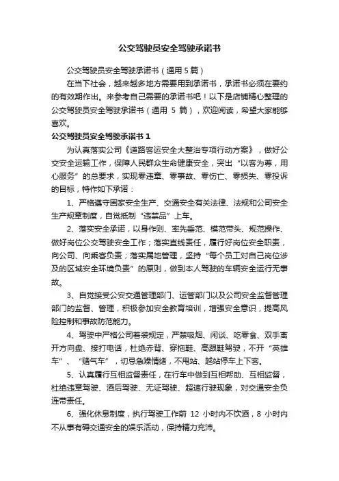 公交驾驶员安全驾驶承诺书1为认真落实公司《道路客运安全大整治专项行动方案》,做好公交安全运输工作,保障人民群众生命健康安全,突出“以客为尊,用心服务”的总要求,实现零违章、零事故、零伤亡、零损失、零投诉的目标,特作如下承诺:1、严格遵守国家安全生产、交通安全有关法律、法规和公司安全生产规章制度,自觉抵制“违禁品”上车。