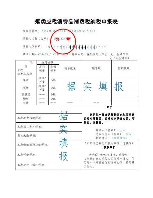 税款所属期:20XX 年X 月X 日至20XX 年X 月X 日纳税人名称(公章):XX 市XX 公司 纳税人识别号:受理人(签章): 受理日期: 年 月 日 受理税务机关(章):公章填表说明一、本表仅限卷烟批发环节消费税纳税人使用。