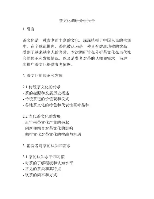 茶文化调研分析报告1. 引言茶文化是一种古老而丰富的文化,深深植根于中国人民的生活中。
