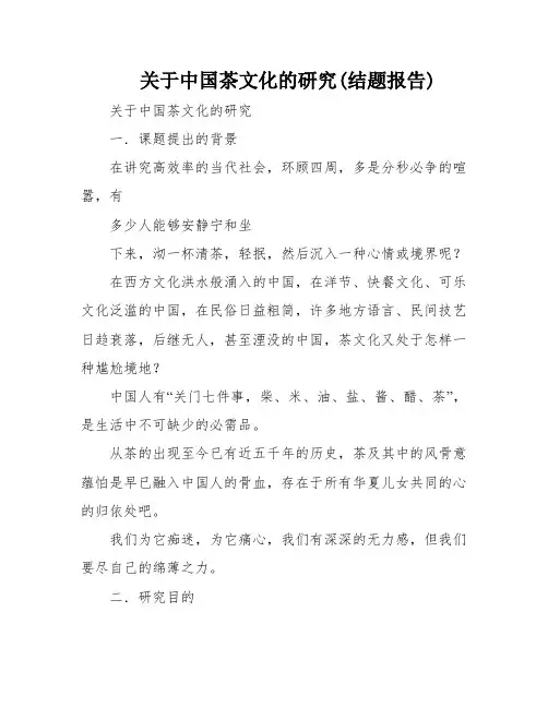2. 茶道文化内涵的研究茶道文化是中国茶文化的重要组成部分,其中包含着丰富的哲学思想和审美观念。
