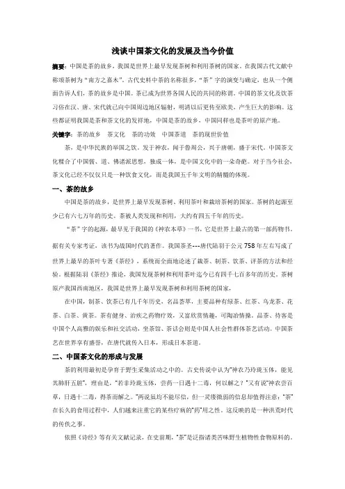 浅谈中国茶文化的发展及当今价值摘要:中国是茶的故乡,我国是世界上最早发现茶树和利用茶树的国家。