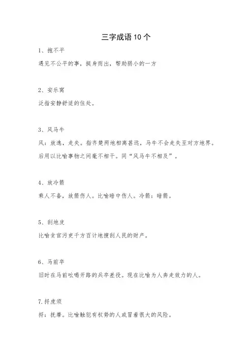 本文部分内容来自网络整理,本司不为其真实性负责,如有异议或侵权请及时联系,本司将立即删除!== 本文为word格式,下载后可方便编辑和修改! ==小学生三字成语大全三字成语 (一)败家子摆架子百里才闭门羹表面光白日梦壁上观百世师并头莲不旋踵饱眼福比翼鸟安乐窝傲霜枝抱不平拜把子不成器并蒂莲三字成语(二)帮倒忙不倒翁半吊子不二门避风港暴发户抱佛脚白费蜡步后尘背黑锅保护伞绊脚石杯中物丑八怪擦边球吃白食唱反调出风头三字成语(三)出锋头唱高调吹鼓手杵臼交炒冷饭车轮战催命鬼吹牛皮擦屁股出气筒长舌妇出头鸟醋坛子出洋相炒鱿鱼钓鳌客打边鼓刀笔吏三字成语(四)对不起东窗计东道主东方骑大锅饭打光棍夺锦才挡箭牌东家丘垫脚石稻粱谋打擂台多面手短平快大手笔蠹书虫掉书袋打死虎三字成语(五)地头蛇胆小鬼单相思定心丸打圆场倒栽葱二把刀耳边风耳报神二百五阿堵物二而一二杆子儿皇帝二流子耳旁风尔汝交二五耦三字成语及其解释:【恶作剧】è zuò jù成语解释:捉弄人的使人难堪的行动。