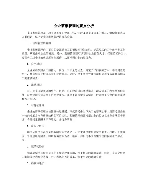 企业薪酬管理的要点分析企业薪酬管理是企业管理中非常重要的一环,它关系着企业内部员工的积极性和团队合作,直接关系到企业的稳定发展和竞争力。