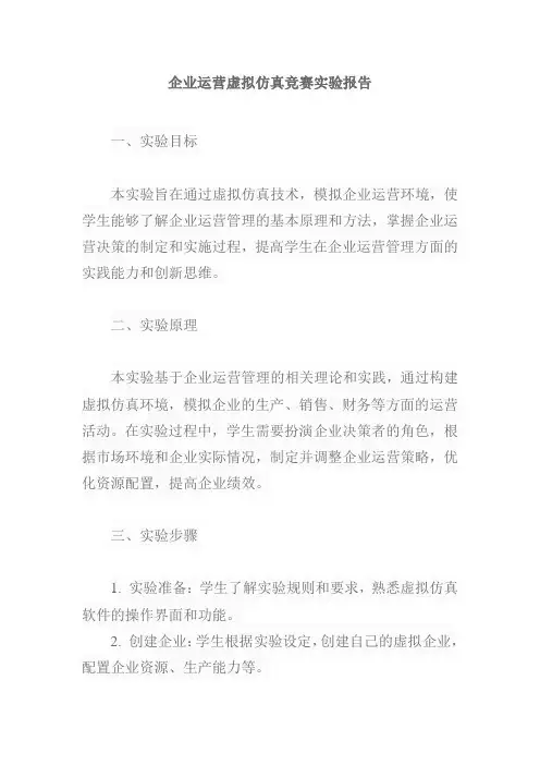 企业运营虚拟仿真竞赛实验报告一、实验目标本实验旨在通过虚拟仿真技术,模拟企业运营环境,使学生能够了解企业运营管理的基本原理和方法,掌握企业运营决策的制定和实施过程,提高学生在企业运营管理方面的实践能力和创新思维。