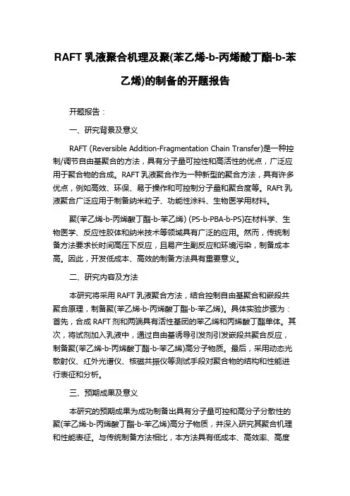 RAFT乳液聚合机理及聚(苯乙烯-b-丙烯酸丁酯-b-苯乙烯)的制备的开题报告开题报告:一、研究背景及意义RAFT (Reversible Addition-Fragmentation Chain Transfer)是一种控制/调节自由基聚合的方法,具有分子量可控性和高活性的优点,广泛应用于聚合物的合成。