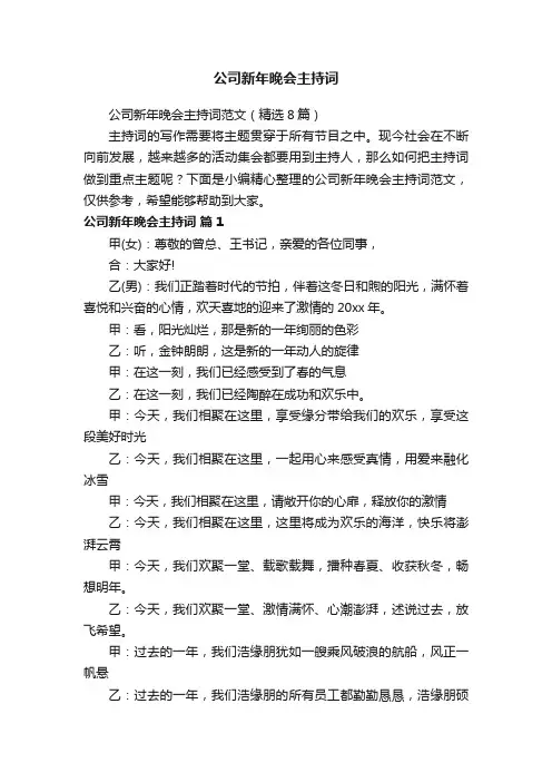 公司新年晚会主持词公司新年晚会主持词范文(精选8篇)主持词的写作需要将主题贯穿于所有节目之中。