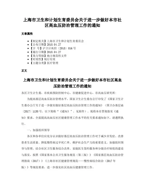 上海市卫生和计划生育委员会关于进一步做好本市社区高血压防治管理工作的通知文章属性•【制定机关】上海市卫生和计划生育委员会•【公布日期】2018.04.27•【字号】沪卫计疾控〔2018〕016号•【施行日期】2018.04.27•【效力等级】地方规范性文件•【时效性】现行有效•【主题分类】医疗管理正文上海市卫生和计划生育委员会关于进一步做好本市社区高血压防治管理工作的通知各区卫生计生委,市疾病预防控制中心、市健康促进中心,市高血压研究所: 为提高基层高血压防治管理水平,国家卫生计生委办公厅印发了《国家卫生计生委办公厅关于进一步做实做好基层高血压防治管理工作的通知》(国卫办基层函〔2017〕1130号,以下简称“《通知》”,见附件)。
