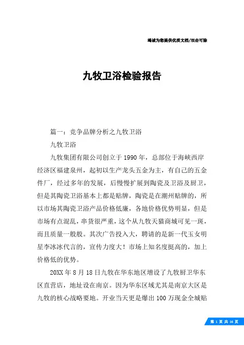 竭诚为您提供优质文档/双击可除九牧卫浴检验报告篇一:竞争品牌分析之九牧卫浴九牧卫浴九牧集团有限公司创立于1990年,总部位于海峡西岸经济区福建泉州,起初以生产龙头五金为主,有自己的五金件厂,经过多年的发展,后慢慢扩展到陶瓷及卫浴及厨卫,但是其陶瓷卫浴基本上都是贴牌,陶瓷是在潮州贴牌的,所以市场其陶瓷卫浴产品价格低廉,各地价格优势明显,但是市场有点混乱,串货很严重,这个从九牧天猫商城可见一斑,而且质量一般般。