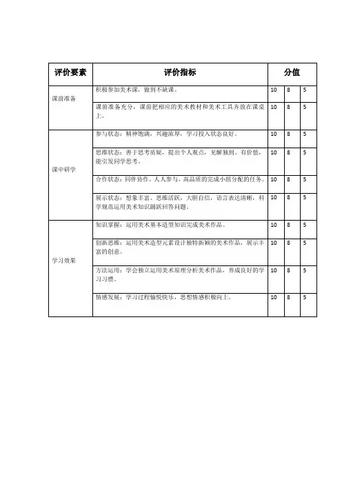 三、评价内容1. 学生美术学习态度和情感评价:(1)对美术学习的兴趣和积极性;(2)对美术学习的态度和投入程度;(3)对美术学习的信心和毅力。