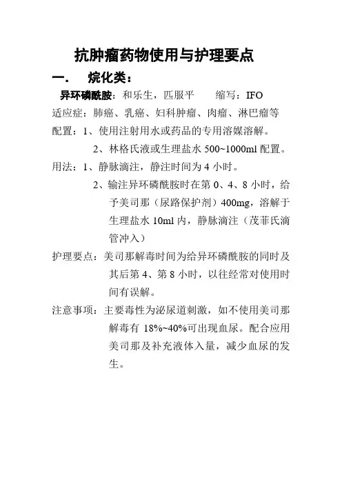 抗肿瘤药物使用与护理要点一.烷化类:异环磷酰胺:和乐生,匹服平缩写:IFO适应症:肺癌、乳癌、妇科肿瘤、肉瘤、淋巴瘤等配置:1、使用注射用水或药品的专用溶媒溶解。