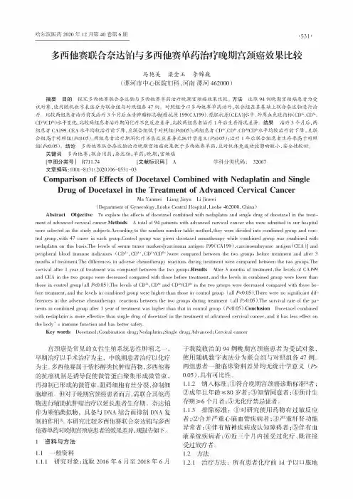 关键词多西他赛;联合用药;奈达4;单药;晚期;宫颈癌[中图分类号]R711.74[文献标识码]A学科分类代码:32067文章编码:1001-8131(2020)06-0531-03Comparison of Effects of Docetaxel Combined with Nedaplatin and Single Drug of Docetaxel in the Treatment of Advanced Cervical CancerMa Yanmei Liang Jinyu Li Jinwei(Department of Gynecology,Luohe Central Hospital,Luohe462000,China)Abstract Objective To explore the effects of docetaxel combined with nedaplatin and single drug of docetaxel in the treatment of advanced cervical cancer.Methods A total of94patients with advanced cervical cancer who were admitted to our hospital were selected as the study subjects.According to the random number table method,they were divided into combined group and control group,with47cases in each group.Control group was given docetaxel monotherapy while combined group was combined with nedaplatin on this basis.The levels of serum tumor markers[carcinoma antigen199(CA199),carcinoembryonic antigen(CEA)]and peripheral blood immune indicators(CD4*,CD8*,CD4y/CD8y)were compared between the two groups before treatment and after3 months of treatment.The differences in adverse chemotherapy reactions during treatment were compared between the two groups.The survival after1year of treatment was compared between the two groups.Results After3months of treatment,the levels of CA199 and CEA in the two groups were decreased compared with those before treatment,and the levels in combined group were lower than those in control group(all!#0.05).The levels of CD4*,CD8*and CD4+/CD8+in the two groups were decreased compared with those before treatment,and the levels in combined group were higher than those in control group(all!#0.05).There were no significant differences in the adverse chemotherapy reactions between the two groups during treatment(all!>0.05).The survival rate of the patients in combined group after1year of treatment was higher than that in control group(!#0.05).Conclusion Docetaxel combined with nedaplatin is more effective than single drug of docetaxel in the treatment of advanced cervical cancer, and it has less effect on the body's immune function and has better safety.Key words Docetaxel;Combination drug;Nedaplatin;Single drug;Advanced;Cervical cancer宫颈癌是常见的女性生殖系统恶性肿瘤之一,早期治疗以手术治疗为主,中晚期患者治疗以化疗为主。