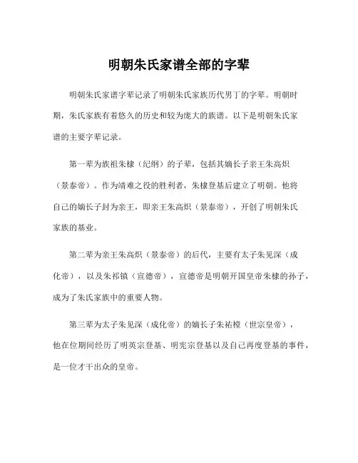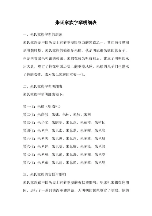 在这篇文档中,我们将为大家详细介绍朱家家谱字辈的大全,希望能够为朱氏家族的后人提供一份参考资料,也希望能够让更多的人了解我们朱氏家族的渊源和发展历程。
