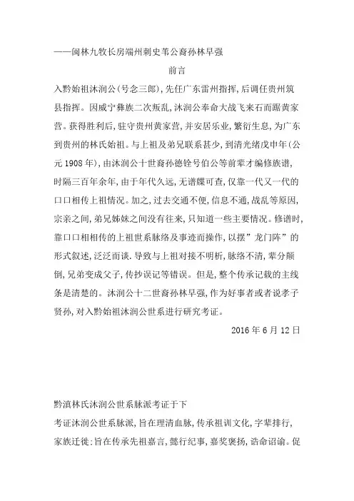 2016年6月12日黔滇林氏沐润公世系脉派考证于下考证沐润公世系脉派,旨在理清血脉,传承祖训文化,字辈排行,家族迁徙;旨在传承先祖嘉言,懿行纪事,嘉奖褒扬,诰命诏谕。