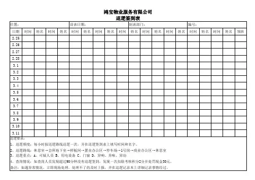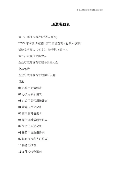 巡逻考勤表篇一:季度巡查表(行政人事部)20XX年季度试验室日常工作检查表(行政人事部)试验室负责人(签字):检查组(签字):篇二:行政部表格大全企业行政部规范管理各表格大全全部免费企业行政部规范管理实用手册目录01办公用品请购表02办公用品领用表03办公用品领用统计表04收发信件登记表05图书资料借出卡06图书资料借阅登记表07来访出入登记表08接待申请及报告表09每月接待客人汇总表10接待汇报表11文件接收登记表12文件归档登记表13文件印制申请单14档案明细表15(机密)文件保管备查簿16调卷单17阅档催还单18档案调阅单19档案存放位置表20阅档催还单存根21作废档案焚毁清单22用印申请表23印章使用登记表24印章销毁申请表25年度会议实施计划表26会议室使用申请表27会议审核表28会议通告单29主席会议准备表30主席会议情况报告表31会议议程表32会议程序表33会议发言要点记录表34会议进行评估表35会议议案检查表36会议进行检查表37会议未决事项检讨表38员工出勤记录表39员工考勤记录汇总表40月度考勤统计表41员工出勤情况统计表42员工加班申请表43加班费申请单44员工请假申请表45员工特别休假申请表46出差申请单47出差登记单48预支差旅费申请单49差旅费用支付明细表50差旅费用报销表51公司年度出差计划表52公关活动预算申请表53公关活动预算一览表54公关活动费用申请表55公关活动预算与实际花费差异表56危机预警处理表57危机记录分析表58员工值班登记表59保安日报表60安全检查日报表61巡逻检查到岗记录表62夜间安全巡查记录表篇三:保安规程汇总1.《保安装备管理规定》····················YH—aB—012.《门岗工作规定》·····················YH—aB—023.《巡逻工作规定》·····················YH—aB—034.《执勤中对有关问题的处理》················YH—aB—045.《保安交接班工作规定》··················YH—aB—056.《保安人员仪容仪表及着装规定》··············YH—aB—067.《保安列队培训规定》···················YH—aB—078.《保安人员奖罚规定》···················YH—aB—089.《保安宿舍管理规定》···················YH—aB—0910.《保安守则》·······················YH—aB—01011.《住宅区紧急突发事件处理程序》··············YH—aB—01112.《保安人员文明用语》···················YH—aB—01213.《保安工作检查办法及标准》················YH—aB—01314.《过失单》························YH—aB—01415.《进入住宅区公寓楼施工凭证》···············YH—aB—01516.《考勤表》························YH—FB—0117.《物品出入登记表》····················YH—aB—01618.《辖区内搬运放行规定》··················YH—aB—01719.《邮件收发登记表》····················YH—aB—01820.21.22.23.24.25.26.《保安人员交接班登记表》·················YH—aB—019《保安班长巡查记录表》··················YH—FB—02《住宅公寓楼防火门开启关闭情》··············YH—FB—03《保安值班登记表》····················YH—aB—020《住宅区出入人员登记表》·················YH—aB—04《安保细则》·······················YH—aB—021《车辆进入登记表》····················YH—aB—02227.《车辆离去登记表》····················YH—aB—02328.《处理违章记录表》····················YH—aB—02429.《公共区域检查表》····················YH—aB—02530.《关于办理施工人员临时出入证的通知》···········YH—aB—02631.《施工人临时出入证》···················YH—aB—02732.《监控员岗位职责》····················YH—aB—02833.《来客来访登记表》····················YH—FB—0534.《巡查记录表》······················YH—aB—02935.《巡楼记录表》······················YH—FB—0636.《巡查问题处理表》····················YH—FB—0737.《保安队长岗位职责》···················YH—aB—03038.《保安工作规程》·····················YH—aB—03139.《保安服务操作流程》···················YH—aB—03240.《保安服务流程》·····················YH—aB—033YH-aB-01保安装备管理规定一、保安人员上班时间应着统一的制服,配戴职员证,穿戴整洁,服装各自保管,如有丢失,则由保安员自己负责赔偿。