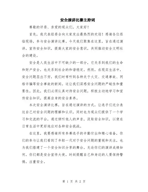 安全演讲比赛主持稿尊敬的评委老师,各位亲爱的同学们,大家好!今天我们齐聚在这里,参加我们学校的安全演讲比赛。