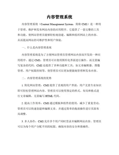 内容管理系统文档一、引言内容管理系统(Content Management System,简称CMS)是一种用于管理和发布网站内容的软件工具。