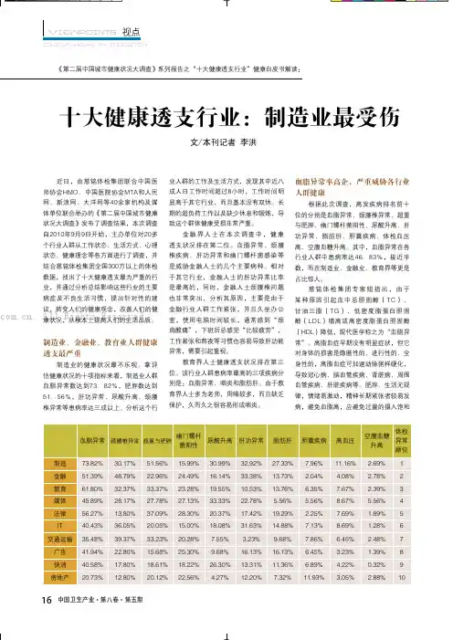 16 中国卫生产业・第八卷・第五期近日,由慈铭体检集团联合中国医师协会HMO、中国医院协会MTA和人民网、新浪网、大洋网等40余家机构及媒体单位联合举办的《第二届中国城市健康状况大调查》发布了调查结果,本次调查自2010年9月9日开始,主办单位对20多个行业人群从工作状态、生活方式、心理状态、健康理念等各方面进行了调查,并结合慈铭体检集团全国300万以上的体检数据,找出了十大健康透支最为严重的行业,并通过分析总结影响这些行业的主要病症及不良生活习惯,提出针对性的建议,转变人们的健康观念,改善人们的健康状况,从根本上提高人们的生活品质。