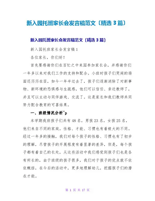 新入园托班家长会发言稿范文〔精选3篇〕新入园托班家长会发言稿范文〔精选3篇〕新入园托班家长会发言稿1各位家长,你们好!首先要感谢你们在百忙之中来园参加家长会,并感谢你们一年多以来对我们工作的支持和配合。