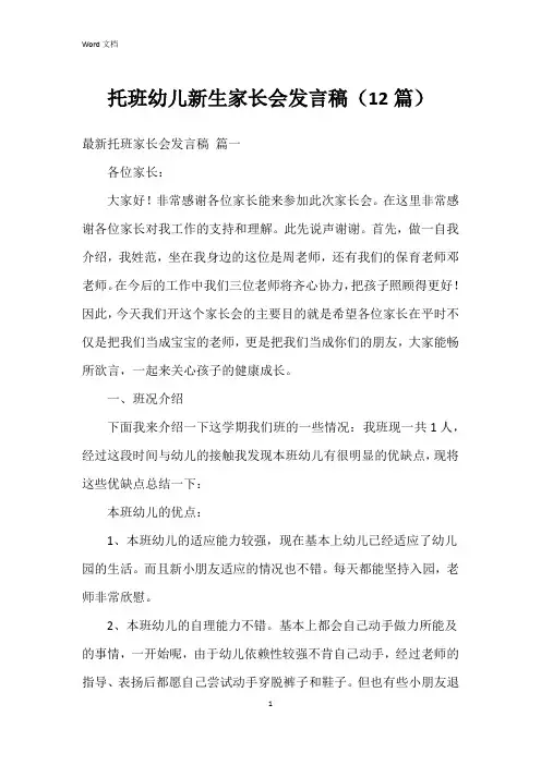 托班幼儿新生家长会发言稿(12篇)最新托班家长会发言稿篇一各位家长:大家好!非常感谢各位家长能来参加此次家长会。