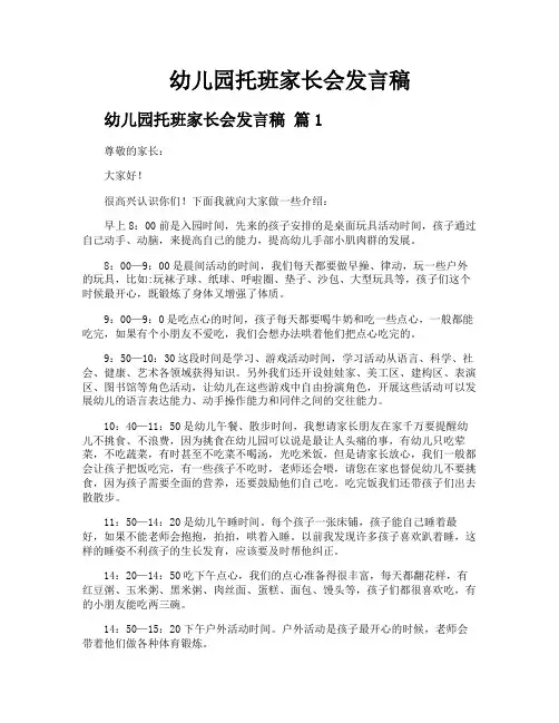 幼儿园托班家长会发言稿(11篇)幼儿园托班家长会发言稿1各位家长:中午好!我们非常感谢各位家长能来参加今中午的家长会。