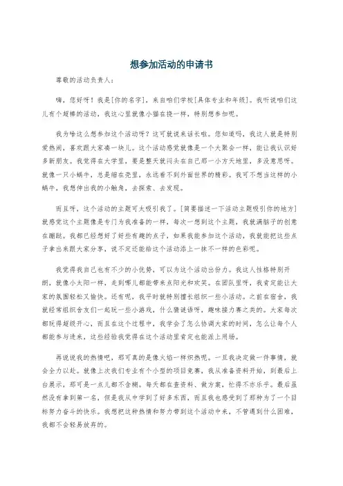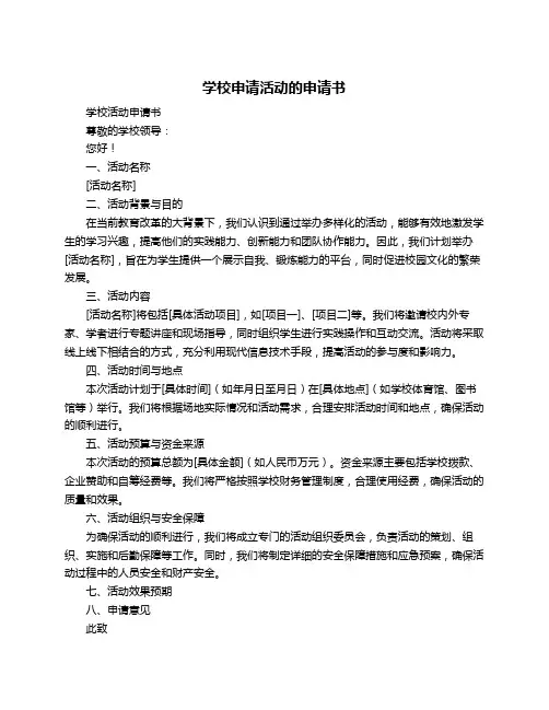 1. 题目:申请XX学校XX活动的申请书2. 格式:申请书一般包括以下几个部分:标题、正文、申请者个人信息、联系方式、日期、申请人签名。