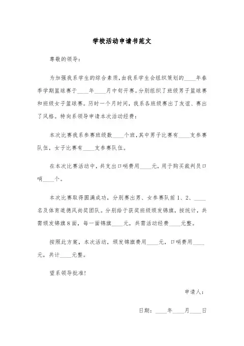 学校活动申请书范文尊敬的领导:为加强我系学生的综合素质,由我系学生会组织策划的____年春季学期篮球赛于____年____月中旬开赛。