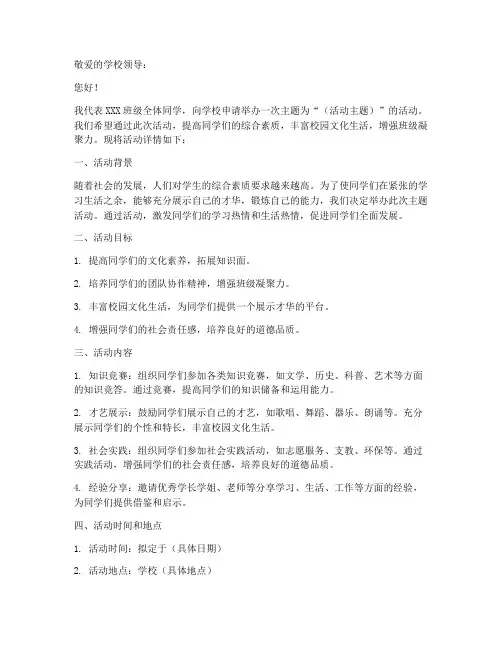 望系领导批准!申请人:日期:____年____月____日学校活动申请书范文(2)尊敬的学校领导:我是学校XX班的学生,我写此信是为了申请举办一项学校活动。