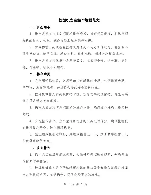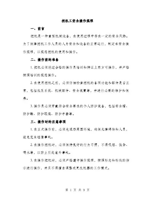挖掘机作业安全操作规程一、前言为了保障挖掘机作业过程中的安全,提高作业效率,特制定本挖掘机作业安全操作规程。