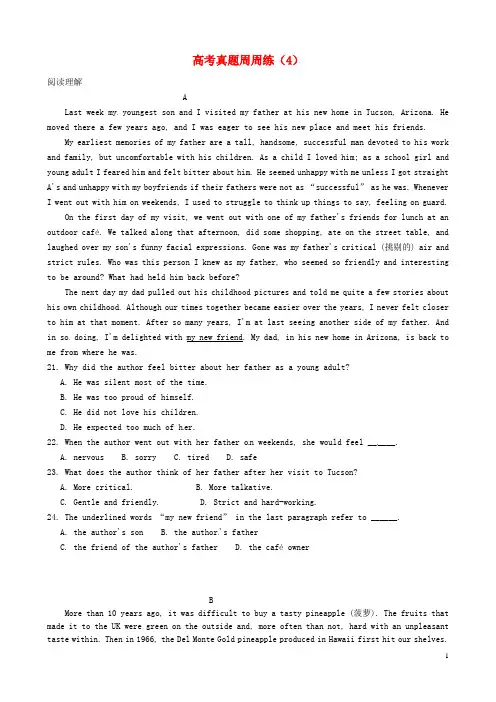 高考真题周周练(4)阅读理解ALast week my youngest son and I visited my father at his new home in Tucson, Arizona. He moved there a few years ago, and I was eager to see his new place and meet his friends.My earliest memories of my father are a tall, handsome, successful man devoted to his work and family, but uncomfortable with his children. As a child I loved him; as a school girl and young adult I feared him and felt bitter about him. He seemed unhappy with me unless I got straight A's and unhappy with m y boyfriends if their fathers were not as “successful” as he was. Whenever I went out with him on weekends, I used to struggle to think up things to say, feeling on guard. On the first day of my visit, we went out with one of my father's friends for lunch at an outdoor café. We talked along that afternoon, did some shopping, ate on the street table, and laughed over my son's funny facial expressions. Gone was my father's critical (挑剔的) air and strict rules. Who was this person I knew as my father, who seemed so friendly and interesting to be around? What had held him back before?The next day my dad pulled out his childhood pictures and told me quite a few stories about his own childhood. Although our times together became easier over the years, I never felt closer to him at that moment. After so many years, I'm at last seeing another side of my father. And in so doing, I'm delighted with my new friend. My dad, in his new home in Arizona, is back to me from where he was.21. Why did the author feel bitter about her father as a young adult?A. He was silent most of the time.B. He was too proud of himself.C. He did not love his children.D. He expected too much of h er.22. When the author went out with her father o n weekends, she would feel ______.A. nervousB. sorryC. tiredD. safe23. What does the author think of her father after her visit to Tucson?A. More critical.B. More talkative.C. Gentle and friendly.D. Strict and hard-working.24. The underlined words “my new friend” in the last paragraph refer to ______.A. the author's sonB. the author's fatherC. the friend of the author's fatherD. the café ownerBMore than 10 years ago, it was difficult to buy a tasty pineapple (菠萝). The fruits that made it to the UK were green on the outside and, more often than not, hard with an unpleasant taste within. Then in 1966, the Del Monte Gold pineapple produced in Hawaii first hit our shelves.The new type of pineapple looked more yellowy-gold than green. It was slightly so fter on the outside and had a lot of juice inside. But the most important thing about this new type of pineapple was that it was twice as sweet as the hit-and-miss pineapples we had known. In no time, the Del Monte Gold took the market by storm, rapidly becoming the world's best-selling pineapple variety, and delivering natural levels of sweetness in the mouth, up until then only found in tinned pineapple.In nutrition (营养) it was all good news too. This nice-tasting pineapple contained four times more vitamin C (维生素C) than the old green variety. Nutritionists said that it was not only full of vitamins, but also good against some diseases. People were understandably eager to be able to buy this wonderful fruit. The new type of pineapple was selling fast, and the Del Monte Gold pineapple rapidly became a fixture in the shopping basket of the healthy eater. Seeing the growing market for its winning pineapple, Del Monte tried to keep the market to itself. But other fruit companies developed similar pineapples. Del Monte turned to law for help, but fail ed. Those companies argued successfully that Del Monte's attempts to keep the golden pineapple for itself were just a way to knock them out of the market.25. We learn from the text that the new type of pineapple is ______.A. green outside and sweet insideB. good-looking outside and soft insideC. yellowy-gold outside and hard insideD. a little soft outside and sweet ins ide26. Why was the new type of pineapple sel ling well?A. It was rich in nutrition and tasted nice.B. It was less sweet and good for health.C. It was developed by Del Monte.D. It was used as medicine.27. The underlined word “fixture” in Paragraph 3 probably refers to something ______.A. that people enjoy eatingB. that is always presentC. that is difficult to getD. that people use as a gift28. We learn from the last paragraph that Del Monte ______.A. allowed other companies to develop pineapplesB. succee ded in keeping the pineapple for itselfC. tried hard to control the pineapple marketD. planned to help the other companies完形填空From the time each of my children started school, I packed their lunches. And in each lunch,I 41 a note. Oft en written on a napkin (餐巾), it might be a thank-you for a 42 moment,a reminder of something we were happily expecting, or a bit of 43 for the coming test or sporting event.In early grade school the y 44 their notes. But as children grow older they become self-conscious (有自我意识的), and 45 he reached high school, my older son, Marc, informed me he no longer 46 my daily notes. Telling him that he no longer needed to 47 them but I still needed to write them, I 48 until the day he graduated.Six years after high school graduation, Marc called and asked if he could move 49 for a couple of months. He had spent those years well, graduating from college, 50 two internships (实习) in Washington, D.C., and 51 , becoming a technical assistant in Sacramento. 52 short vacation visits, however, he had lived away from home. With his younger sister leaving for college, I was 53 happy to have Marc back. Since I was 54 making lunch for his younger brother, I 55 one for Marc, too. Imagine my 56 when I got a call from my 24-yere-old son, 57 his lunch.“Did I do something 58 ? Don't you love me 59 , Mom?” were just a few of the questions he threw at me as I 60 asked him what was wrong.“My note, Mom,” he answered. “Where's my note?”41. A. carri