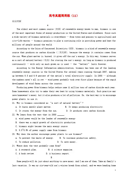 高考真题周周练(11)阅读理解AThe oldest and most common source (来源) of renewable energy known to man, biomass is one of the most important forms of energy production in the United States and elsewhere. Since such a wide variety of biomass materials is everywhere — from trees and grasses to a gricultural and city-life wastes — bioma ss promises to play a continuing role in providing power and heat for millions of people around the world.According to the Union of Concerned Scientists (UCS), biomass is a kind of renewable energy source that produces no carbon dioxide (二氧化碳), because the energy it contains comes from the sun. When plant matter is burned, it gives off the sun's energy. In this way, biomass serves as a sort of natural battery (电池) for storing the sun's energy. As long as biomass is produced continuously — with only as much grown as is used — the “battery” lasts forever.According to the Energy Information Administration, biomass has been one of the leading renewable energy sources in the United States for several years running through 2007, making up between 0.5 and 0.9 percent of the nation's total electricity supply. In 2008 — although the numbers aren't all in yet — wind power probably took over first place because of the rapid development of wind farms across the country.Producing power from biomass helps reduce some 11 million tons of carbon dioxide each year. Some homeowners also try to make their own heat by using biomass materials. Such practice may save homeowner's money, but it also produces a lot of pollution. So, the best way is to encourage power plants to use it.21. Why is biomass considered as “a sort of natural battery”?A. It burns merely plant matter.B. It keeps producing electricity.C. It stores the energy from the sun.D. It produces zero carbon dioxide.22. We learn from the text that in 2008 ______.A. wind power would be the leader of renewable energyB. there was a rapid growth of electricity productionC. biomass might become the main energy sourceD. 0.5~0.9% of power supply came from biomass23. Why does the author encourage power plants to use biomass?A. To prevent the waste of energy.B. To increase production safety.C. To reduce pollution.D. To save money.24. Where does the text probably come from?A. A research plan.B. A science magazine.C. A book review.D. A business report.BSome people will do just about anything to save money. And I am one of them. Take my family's last vacation. It was my six-year-old son's win ter break from school, and we were heading homefrom Fort Lauderdale after a weeklong trip. The flight was overbooked, and Delta, the airline, offered us $400 per person in credits to give up our seats and leave the next day. I had meetingsin New York, so I had to get back. But that didn't mean my husband and my son couldn't stay.I took my nine-month-old and t ook off for home.The next day, my husband and son were offered more credits to take an even later flight. Yes, I encouraged — okay, ordered — them to wait it out at the airport, to "earn" more Delta Dollars. Our total take: $1,600. Not bad, huh?Now some people may think I'm a bad mother and not such a great wife either. But as a big-time bargain hunter, I know the value of a dollar. And these days, a good deal is something few of us can afford to pass up.I've made a living looking for the best deals and exposing (揭露) the worst tricks. I have been the consumer reporter of NBC's Today show for over a decade. I have written a couple of books including one titled Tricks of the Trade: A Consumer Survival Guide. And I really do what I believe in.I tell you this because there is no shame in getting your money's worth. I'm also tightfisted when it comes to shoes, clothes for my children, and expensive restaurants. But I wouldn't hesitate to spend on a good haircut. It keeps its shape longer, and it's the first thing people notice. And I will also spend on a classi c piece of furniture. Quality lasts.25. Why did Delta give the author's family credits?A. Their flight had been delayed.B. They had early bookings.C. They took a later flight.D. Their flight had been cancelled.26. What can we learn about the author?A. She is very strict with her children.B. She seldom makes a compromise.C. She rarely misses a good deal.D. She is interested in cheap products.27. What does the author do?A. She's a teacher.B. She's a housewife.C. She's a media person.D. She's a businesswoman.28. What does the author want to tell us?A. How to expose bad tricks.B. How to reserve airline seats.C. How to spend money wisely.D. How to make a business deal.完形填空Joe Simpson and Simon Yates were the first people to climb the West Face of the Siula Grandein the Andes mountains. They reached the top 41 , but on their way back conditions were very 42 . Joe fell and broke his leg. They both knew that if Simon 43 alone, he would probably get back 44 . But Simon decided to risk his 45 and try to lower Joe down the mountain on a rope (绳).As they 46 down, the weather got worse. Then another 47 occurred. They couldn't seeor hear each other and, 48 , Simon lowered his friend over the edge of a precipice (峭壁).It was 49 for Joe to climb back or for Simon to pull him up. Joe's 50 was pulling Simon slowly towards the precipice. 51 , after more than an hour in the dark and the icy cold, Simon had to 52 . In tears, he cut the rope. Joe 53 into a huge crevasse (裂缝) in the ice below. He had no food or water and he was in terrible pain. He couldn't walk, but he 54 to get out of the crevasse and started to 55 towards their camp, nearly ten kilometers 56 .Simon had 57 the camp at the f oot of the mountain. He thought that Joe must be 58 , but he didn't want to leave 59 . Three days later, in the middle of the night, he heard Joe's voice. He couldn't 60 it. Joe was there, a few meters from their tent, still alive.41. A. hurriedly B. carefully C. successfully D. early42. A. difficult B. s