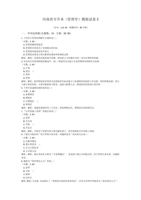 河南省专升本(管理学)模拟试卷5(总分:118.00,做题时间:90分钟)一、单项选择题(总题数:40,分数:80.00)1.下列关于管理的理解不正确的是( )(分数:2.00)A.管理的载体是组织B.管理的目的是为了实现既定的目标C.管理的对象是组织中的人√D.管理的本质是合理分配和协调各种资源的过程解析:解析:管理的对象是相关资源,即包括人力资源在内的一切可以调用的资源。