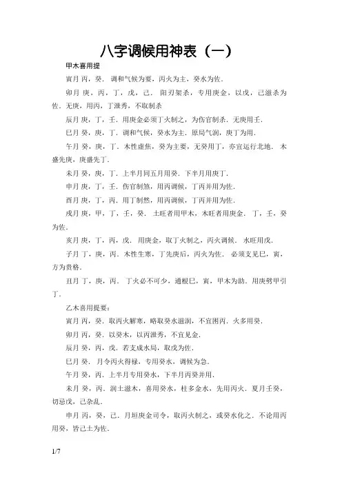 调侯用神表丑 子 亥 戌 酉 申 未 午 巳 辰 卯 寅余 氏 调 候 用 神 表十 二 月 十 一 月 十 月 九 月 八 月 七 月 六 月 五 月 四 月 三 月 二 月 正 月丁 丙 庚 丁 丙 庚庚 戊 丁 丙 庚 壬 甲 癸 丁 庚 丙 丁 庚 壬 丁 癸 庚 丁 癸 庚 丁 癸 庚 丁 庚 壬 丁庚 戊 丙 己 丁丙 癸 甲丙 丙 丙 戊 癸 辛 癸 丁 丙 丙 己 癸癸 丙 癸 丙癸 癸 戊 丙 丙 癸 丙 癸 乙 壬 甲 壬 己戊 甲 庚 戊 壬甲 壬 壬 癸 壬 戊 壬 庚 壬 庚 壬 癸庚 壬 甲 壬 己 壬 庚 丙甲 庚 甲 庚 甲 庚 甲 戊庚 甲 丙 庚 戊 甲 丙 庚 戊 甲 庚 壬 壬 癸 庚甲 庚 甲 庚 庚 甲 甲庚 丁丙 甲 丙 甲 甲 丙 甲 癸丙 丙 癸 丙 甲 癸 癸 甲 丙 壬 丙 甲 甲 癸 丙 甲 癸 丙 丙 癸 甲 丙 癸 甲 戊 丙 戊 甲 丙 戊 甲 丙 戊 甲 甲 癸 丙 丙 癸 丙 癸 癸 丙 癸 丙 癸丙 丙 甲 癸 甲 癸 丙 丙 甲 庚 己 丙 甲 丁丁 丙 甲丁 丙 甲 壬丁 丙 甲丁 甲丁 甲壬 癸 壬 丙戊 丁 甲 壬 丁 癸 丁 丙 甲 庚 戊 丙 甲 丁壬 庚丙 丙 壬 壬 壬 壬 壬壬 壬壬 壬 己辛月 支 日干甲木喜用提要:寅月 丙,癸. 调和气候为要,丙火为主,癸水为佐.卯月 庚,丙,丁,戊,己. 阳刃架杀,专用庚金,以戊,己滋杀为佐.无庚,用丙,丁泄秀,不取制杀辰月 庚,丁,壬.用庚金必须丁火制之,为伤官制杀.无庚用壬.巳月 癸,庚,丁.调和气候,癸水为主.原局气润,庚丁为用. 午月 癸,庚,丁.木性虚焦,癸为主要,无癸用丁,亦宜运行北地. 木盛先庚,庚盛先丁.未月 癸,庚,丁.上半月同五月用癸.下半月用庚丁.申月 庚,丁,壬.伤官制煞,用丙调候,丁丙并用为佐.酉月 庚,丁,丙.用丁制然,用丙调候,丁丙并用为佐.戌月 庚,甲,丁,壬,癸. 土旺者用甲木,木旺者用庚金. 丁,壬,癸为佐. 亥月 庚,丁,丙,戊. 用庚金,取丁火制之,丙火调候. 水旺用戊.子月 丁,庚,丙.木性生寒,丁先庚后,丙火为佐. 必须支见巳,寅,方为贵格.丑月 丁,庚,丙. 丁火必不可少,通根巳,寅,甲木为助.用庚劈甲引丁.乙木喜用提要:寅月 丙,癸.取丙火解寒,略取癸水滋润,不宜困丙.火多用癸.卯月 丙,癸.以癸木,以丙泄秀,不宜见金.戊 壬 己 壬 戊 甲 丙 甲 甲 戊甲甲 庚 癸 己 癸 甲 甲 甲 庚 壬 丙 甲 丁 戊 丙 戊 庚 丙甲 丙 甲 庚 戊 丁 辛 甲 癸 辛 庚 壬 庚 辛 癸 甲 庚戊 庚 辛 庚 戊 丙壬丙 丁 丙 辛庚 戊 辛 丁 辛 壬 甲 癸辛 丙 丁 庚 壬 辛 癸 庚 辛 癸 壬辛 丙 甲 辛 庚 辛 辛 丙 癸辰月癸,丙,戊.若支成水局,取戊为佐.巳月癸.月令丙火得禄,专用癸水,调候为急.午月癸,丙.上半月专用癸水,下半月丙癸并用.未月癸,丙.润土滋木,喜用癸水,柱多金水,先用丙火.夏月壬癸,切忌戊,己杂乱.申月丙,癸,己.月垣庚金司令,取丙火制之,或癸水化之.不论用丙用癸,皆己土为佐.酉月癸,丙,丁.上半月癸先丙后,下半月丙先癸后,无癸用壬.支成金局,又宜用丁.戌月癸,辛.以金发水之源.见甲,名藤萝系甲.亥月丙,戊.乙木向阳,专取丙火.水多以戊佐.子月丙.寒木向阳,专取丙火,忌见癸水.丑月丙.寒谷回春,专用丙火.丙火喜用提要:寅月壬,庚.壬水为用,庚金发水之源为佐.卯月壬,己.专用壬水,水多用戊制之,身弱用印化之.辰月壬,甲.专用壬水,土重以甲为佐.巳月壬,癸,庚.以庚为佐,忌戊制壬.无壬用癸.午月壬,庚.壬庚以通根申宫为妙.未月壬,庚.以庚为佐.申月壬,戊.壬水通根申宫,壬多必取戊制.酉月壬,癸.四柱多丙,一壬高透为奇.无壬用癸.戌月甲,壬.忌土晦光,先取甲疏土,次用壬水.亥月甲,戊,庚,壬.月垣壬水秉令,水旺用甲木化之,身煞两旺,用戊制之.火旺用壬,木旺宜庚.子月壬,戊,己.气进二阳,丙火弱中复强,用壬水,用戊制之.无戊用己.丑月壬,甲.喜壬为用,土多不可少甲.丁火喜用提要:喜用简略说明寅月甲,庚.用庚金劈甲引丁.卯月庚,甲.以庚去乙,以甲引丁.辰月甲,庚.用甲木引丁制土,次看庚金.巳月甲,庚.取甲引丁,甲多又取庚为先.午月壬,庚,癸.火多以庚壬两透为贵.无壬用癸,为独煞当权.未月甲,壬,庚.以甲木化壬引丁为用,用甲不能无庚,取庚为佐.申月甲,庚,丙,戊.取庚劈甲,无甲用乙.用丙暖金晒甲,无庚甲而用乙者,见丙为枯草引灯.水旺用戊.酉月甲,庚,丙,戊.取庚劈甲,无甲用乙.用丙暖金晒甲,无庚甲而用乙者,见丙为枯草引灯.水旺用戊.戌月甲,庚,戊.一派戊土无甲,为伤官伤尽.亥月甲,庚.庚金劈甲引丁,甲木为尊,庚金为佐,戊癸权宜酌用.子月甲,庚.庚金劈甲引丁,甲木为尊,庚金为佐,戊癸权宜酌用.丑月甲,庚.庚金劈甲引丁,甲木为尊,庚金为佐,戊癸权宜酌用.戊土喜用提要:寅月丙,甲,癸.无丙照暖,戊土不生,无甲疏劈,戊土不灵.无癸滋润,万物不长,先丙,次甲,次癸.卯月丙,甲,癸.无丙照暖,戊土不生,无甲疏劈,戊土不灵.无癸滋润,万物不长,先丙,次甲,次癸.辰月甲,丙,癸.戊土司令,先用甲疏,次丙,次癸.巳月甲,丙,癸.戊土建禄,先用甲疏劈,次取丙癸.午月壬,甲,丙.调候为急,先用壬水,次取甲木,丙火配用.未月癸,丙,甲.调候为急,癸不可缺,丙火配用.土重不能无甲.申月丙,癸,甲.寒气渐增,先用丙火.水多,用甲泄之.酉月丙,癸.赖丙照暖,喜水滋润.戌月甲,丙,癸.戊土当权,先用甲木,次取丙火.见金,先用癸水,后取丙火.亥月甲,丙.非甲不灵,非丙不暖.子月丙,甲.丙火为尚,甲木为佐.丑月丙,甲.丙火为尚,甲木为佐.己土喜用提要:寅月丙,庚,甲.取丙解寒,忌见壬水,如水多,须以戊土为佐.土多用甲,甲多用庚.卯月甲,癸,丙.用甲忌与己土合化,次用癸水润之.辰月丙,癸,甲.先丙后癸,土暖而润,随用甲疏.巳月癸,丙.调候不能无癸,土润不能无丙.