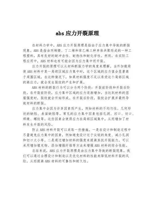 三、ABS材料开裂的原因ABS材料开裂的原因主要有以下几点:1.材料本身的强度不足:ABS材料的抗拉强度、抗压强度和抗剪强度是决定其开裂性能的重要指标。